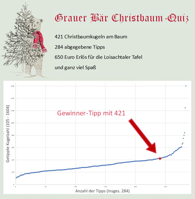 Die Bandbreite der Tipps war doch sehr hoch. Die niedrigste Kugelschätzung lag bei 105, die Höchste bei 1604. Der Trend ging allerdings hin zu niedrigen Angaben – 84% aller Tipps lagen zu niedrig. Dies am besten fürs nächste Weihnachtsfest merken – dann gibt es sicherlich wieder ein Christbaumquiz im Grauen Bären.
